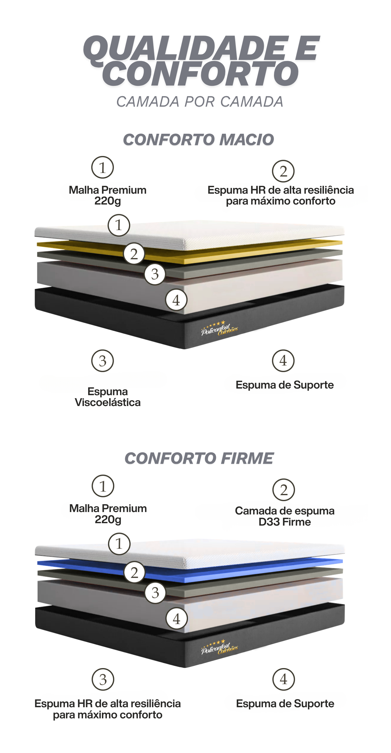 Produzido pela Policonfort, referência em espumas e tecnologia para descanso, você compra sem intermediários, garantindo: